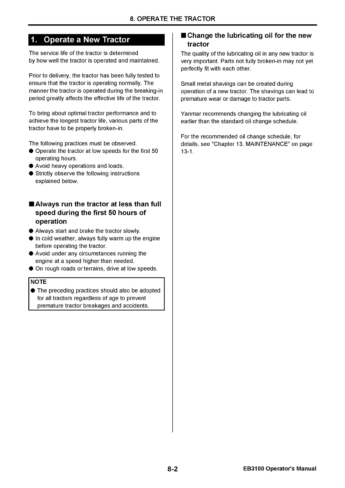 Yanmar EB3100 - Operate a New Tractor; Always run the tractor at less than full speed during the first 50 hours of operation; Change the lubricating oil for the new tractor