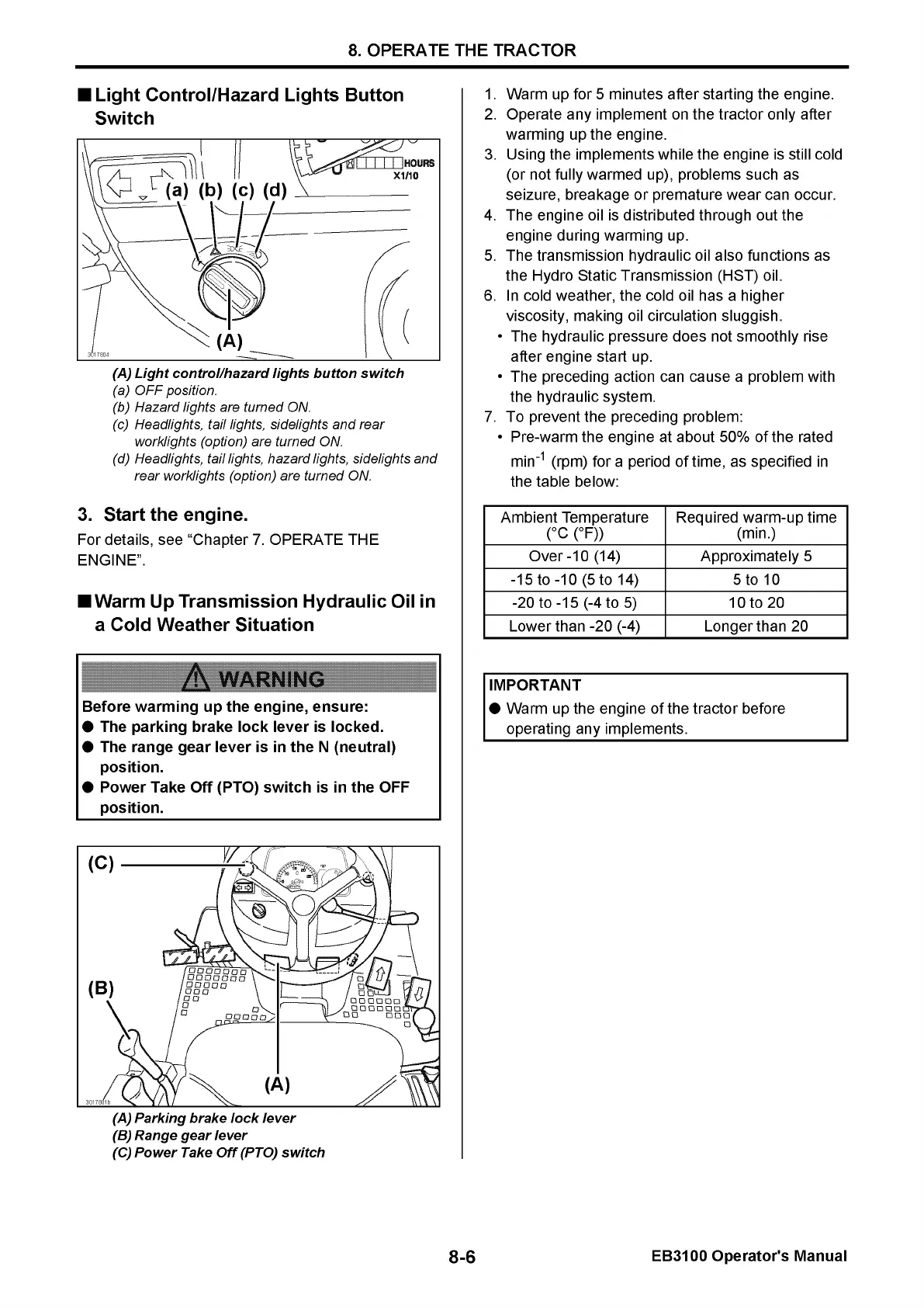 Yanmar EB3100 - Light Control;Hazard Lights Button Switch; Warm Up Transmission Hydraulic Oil in a Cold Weather Situation