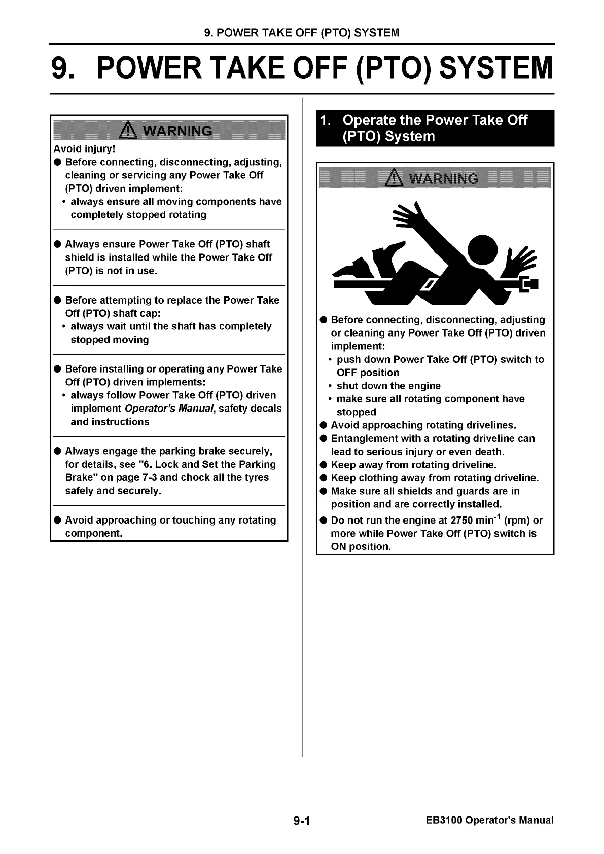 Yanmar EB3100 - 9. POWER TAKE OFF (PTO) SYSTEM; Operate the Power Take Off (PTO) System