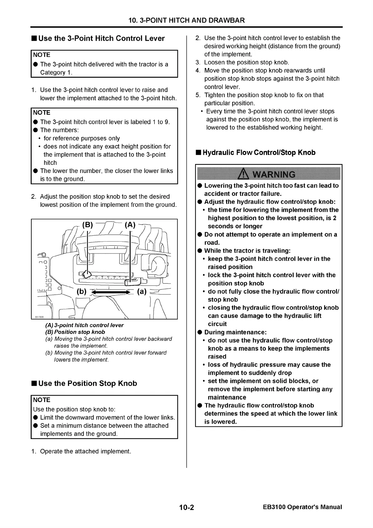 Yanmar EB3100 - Use the 3-Point Hitch Control Lever; Use the Position Stop Knob; Hydraulic Flow Control;Stop Knob