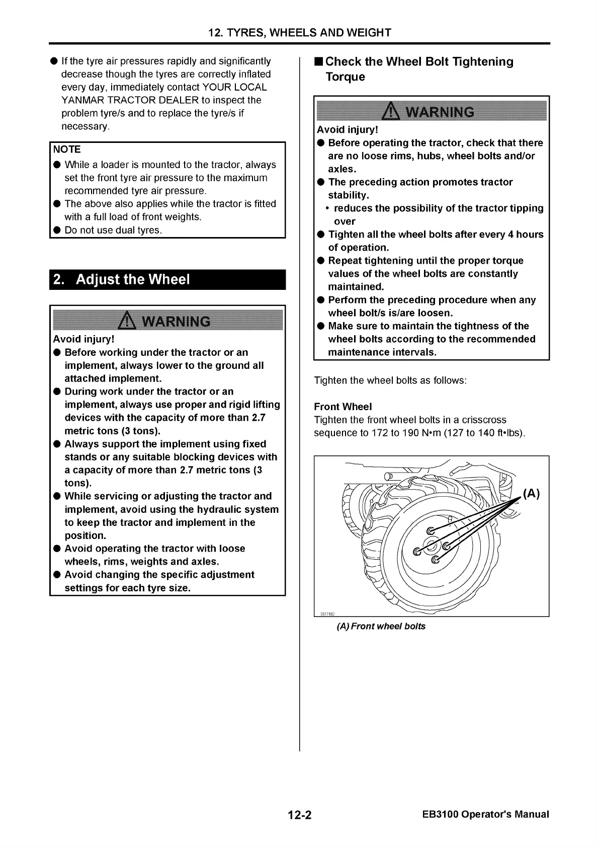 Yanmar EB3100 - Adjust the Wheel; Check the Wheel Bolt Tightening Torque
