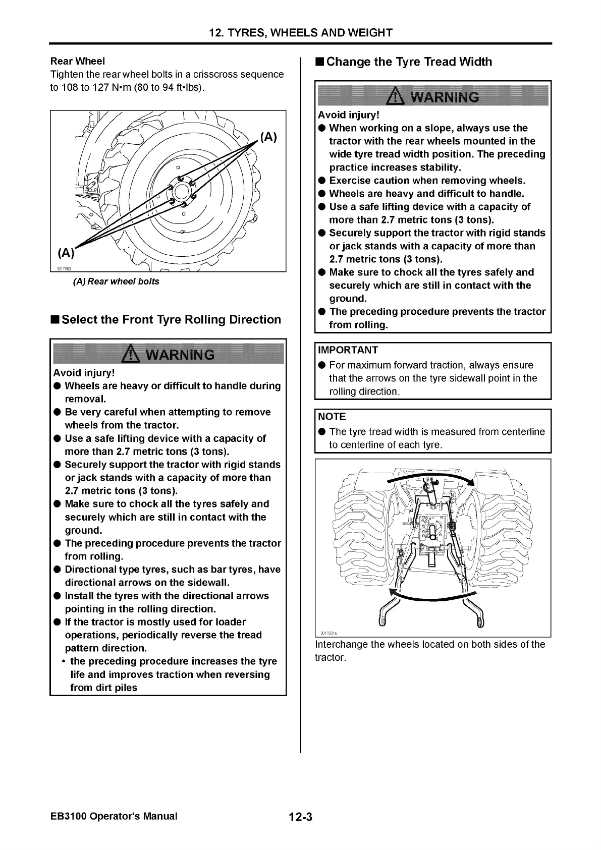 Yanmar EB3100 - Select the Front Tyre Rolling Direction; Change the Tyre Tread Width