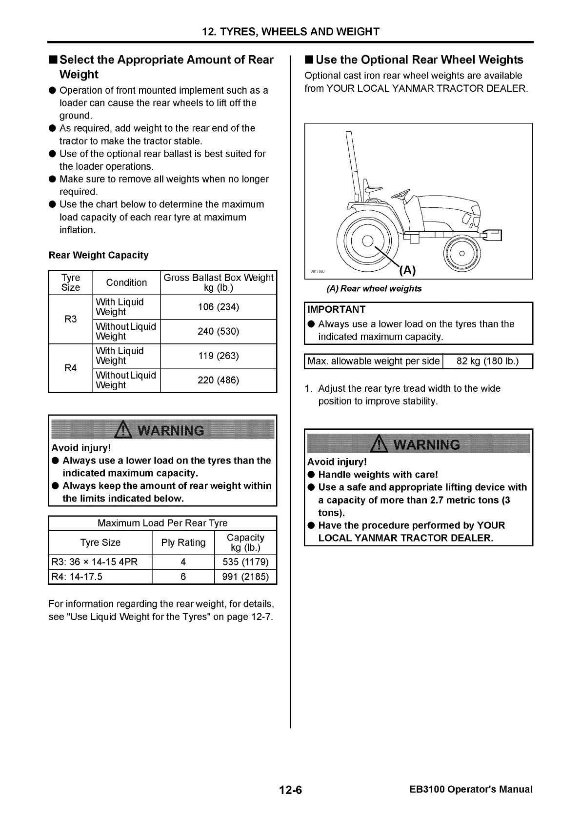 Yanmar EB3100 - Select the Appropriate Amount of Rear Weight; Use the Optional Rear Wheel Weights