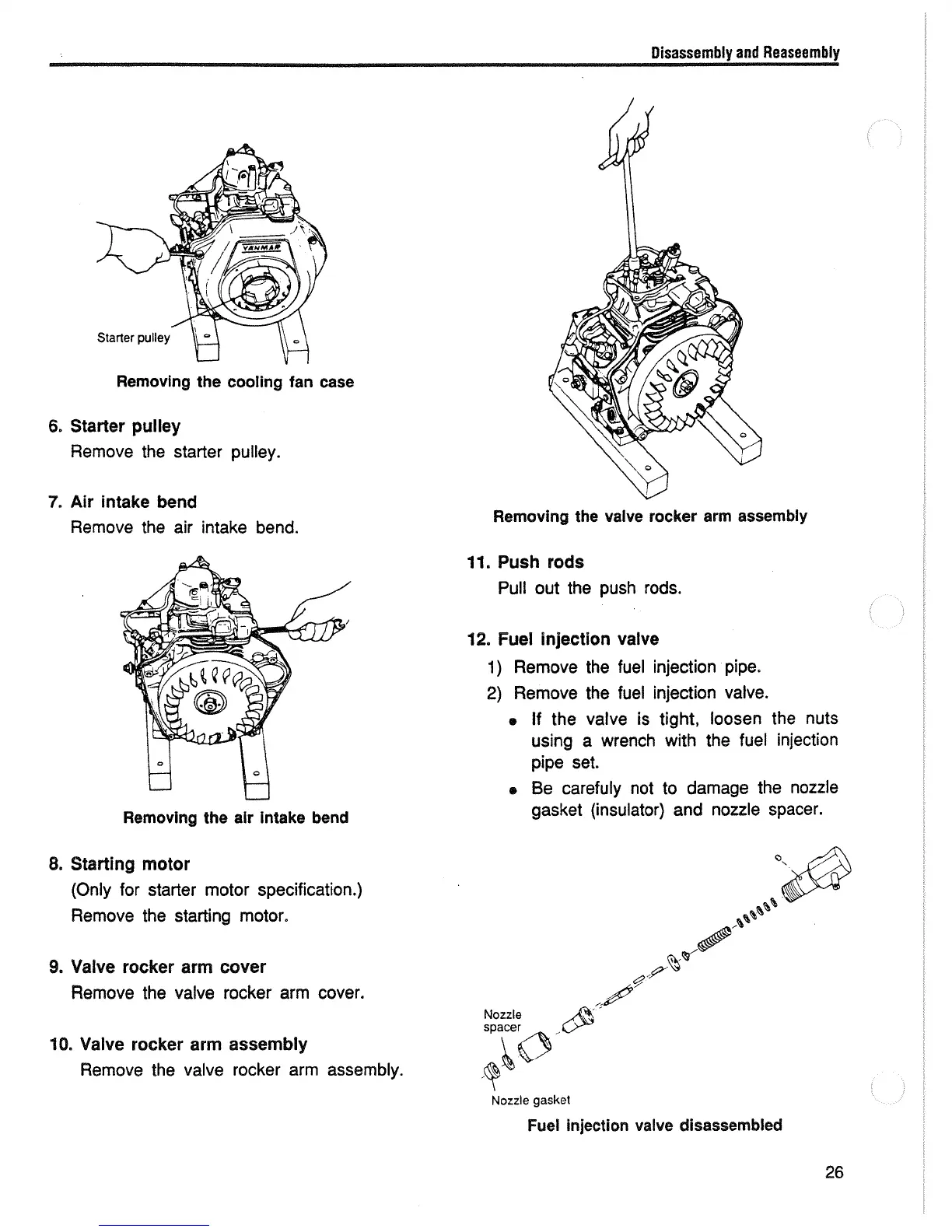 Yanmar L100AE - Removing the Cooling Fan Case;Starter Pulley;Air Intake Bend; Removing the Valve Rocker Arm Assembly; Fuel Injection Valve Disassembly