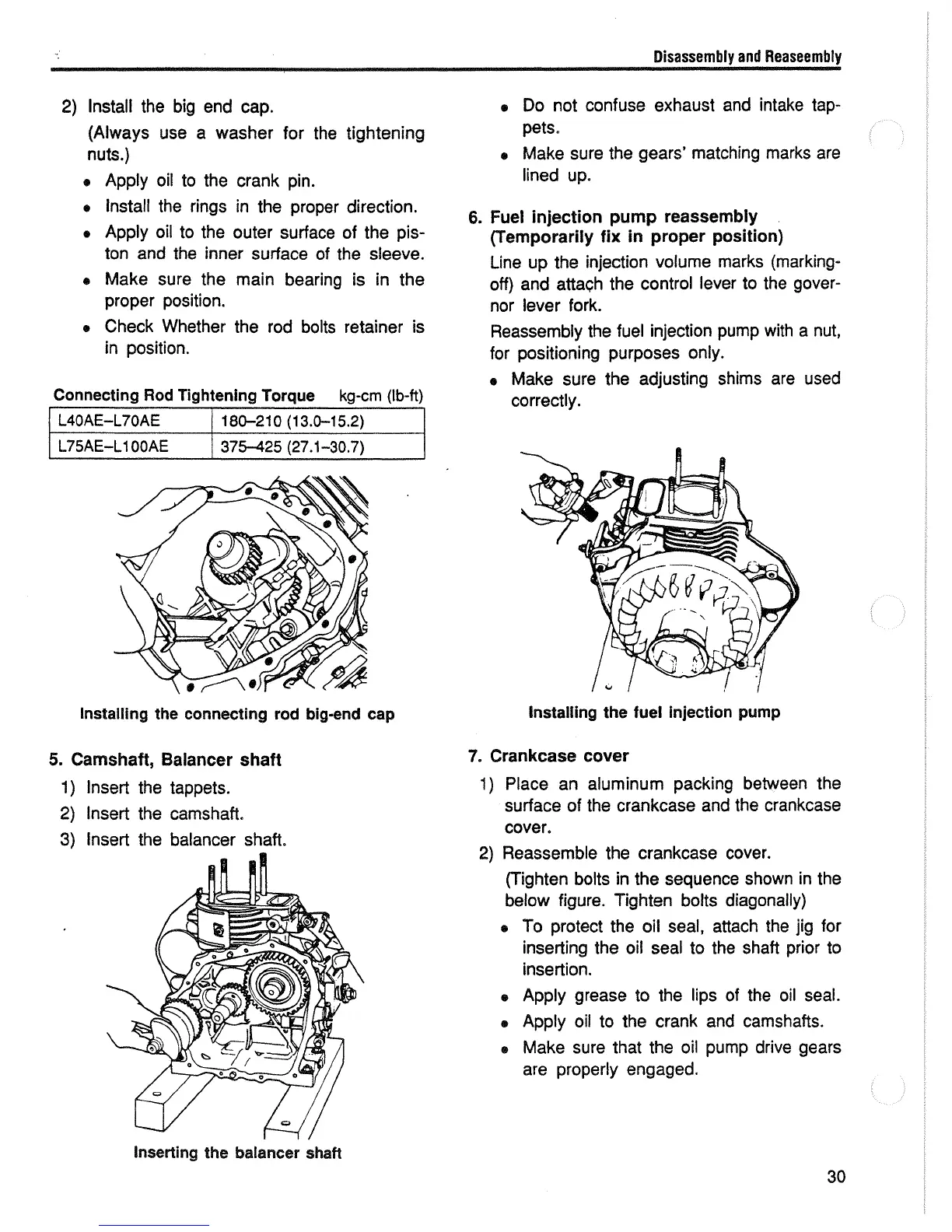Yanmar L100AE - Installing the Camshaft, Balancer Shaft; Fuel Injection Pump Reassembly; Installing Crankcase Cover
