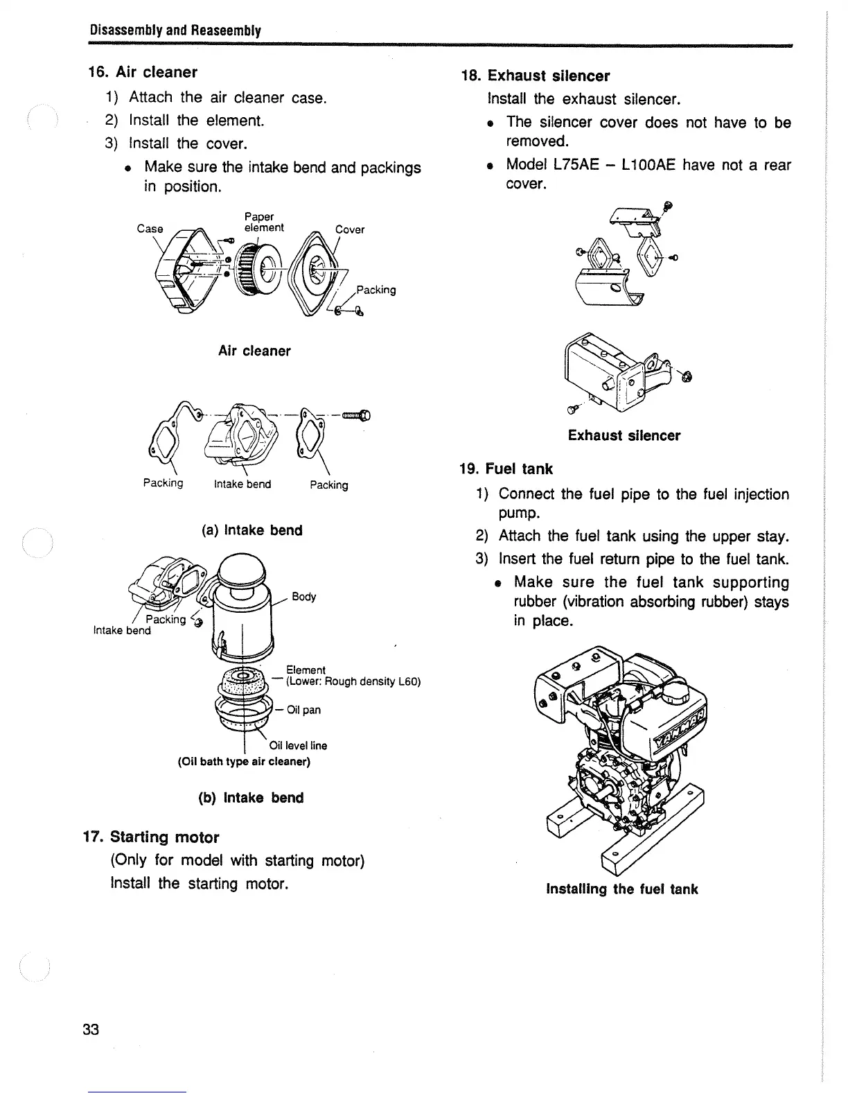 Yanmar L100AE - Installing the Air Cleaner; Installing the Starting Motor; Installing the Fuel Tank