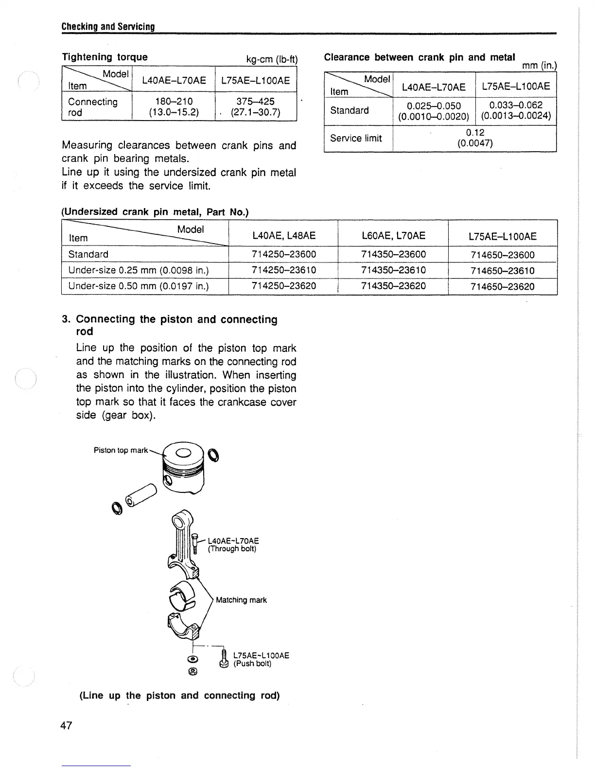 Yanmar L100AE - Connecting the Piston and Connecting Rod; Clearance between Crank Pin and Metal Table; Tightening Torque Table; Undersized Crank Pin Metal, Part No. Table