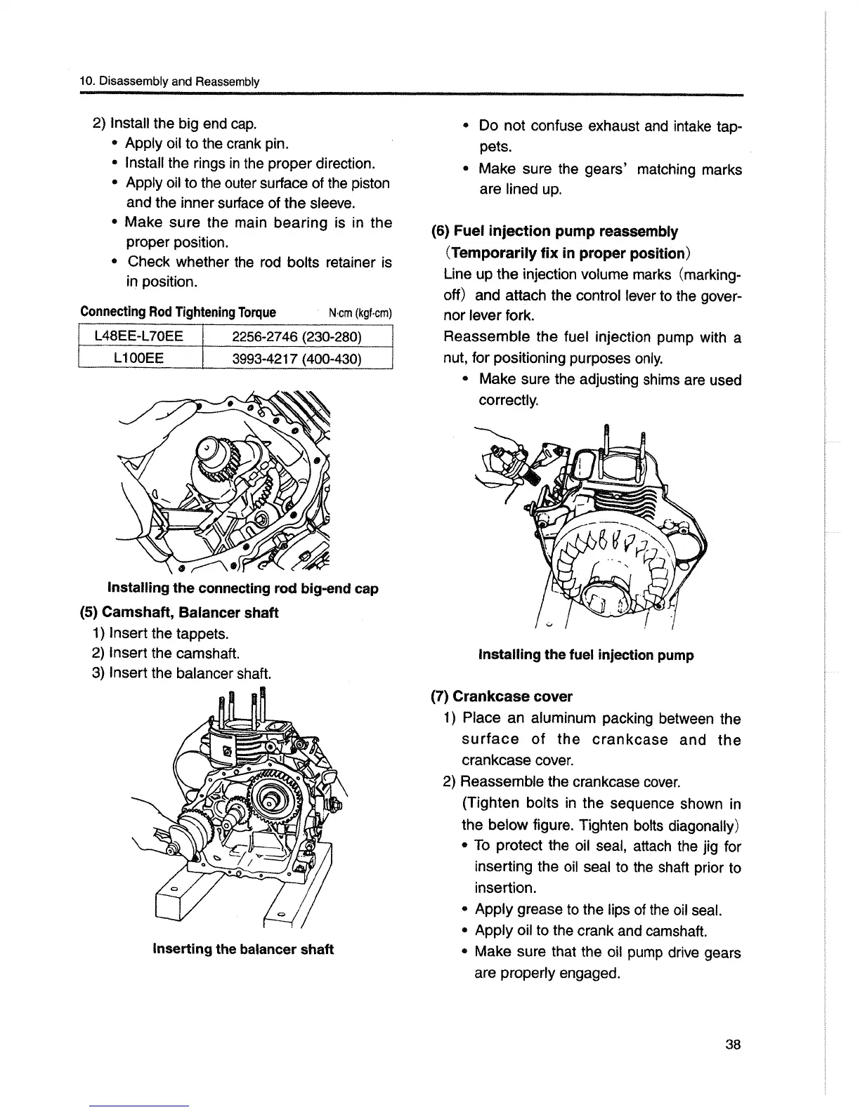 Yanmar L100EE - Piston and Connecting Rod Reassembly; Camshaft and Balancer Shaft Reassembly; Fuel Injection Pump Reassembly; Crankcase Cover Reassembly