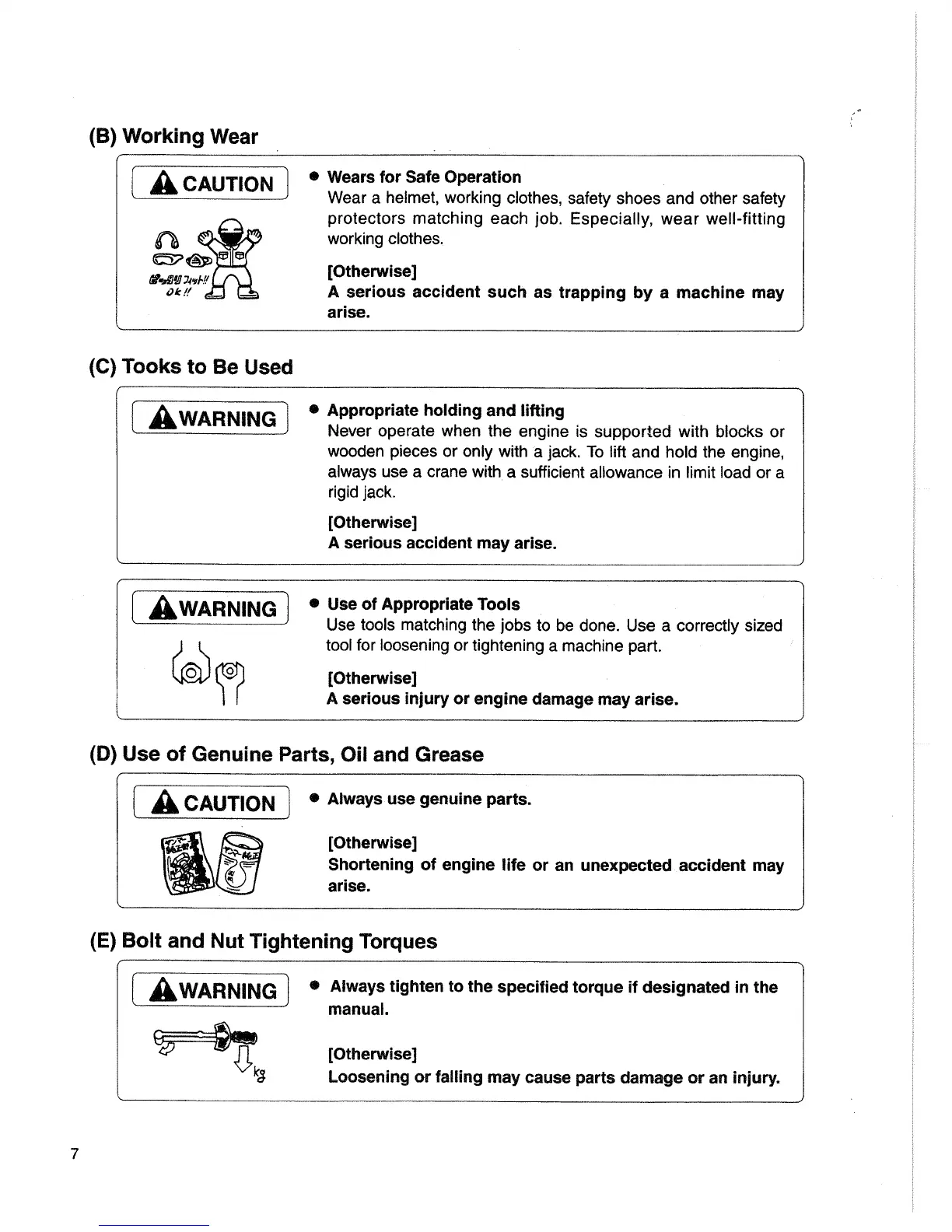 Yanmar L48EE - Working Wear Precautions; Tools to Be Used; Use of Genuine Parts, Oil and Grease; Bolt and Nut Tightening Torques