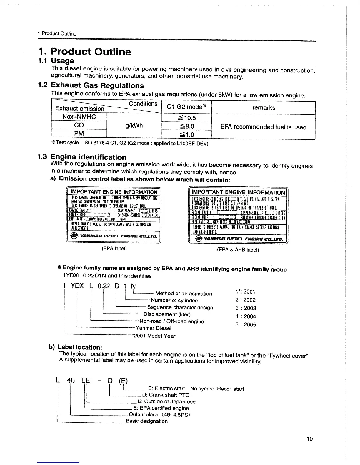 Yanmar L48EE - Product Outline; Usage; Exhaust Gas Regulations; Engine Identification