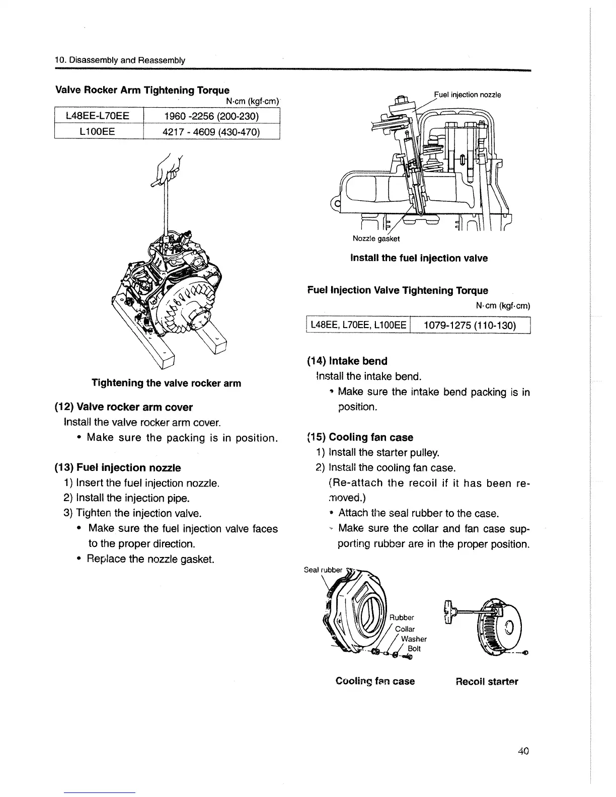 Yanmar L48EE - Valve Rocker Arm Tightening Torque; Fuel injection valve Reassembly; Intake bend Reassembly; Cooling fan case Reassembly