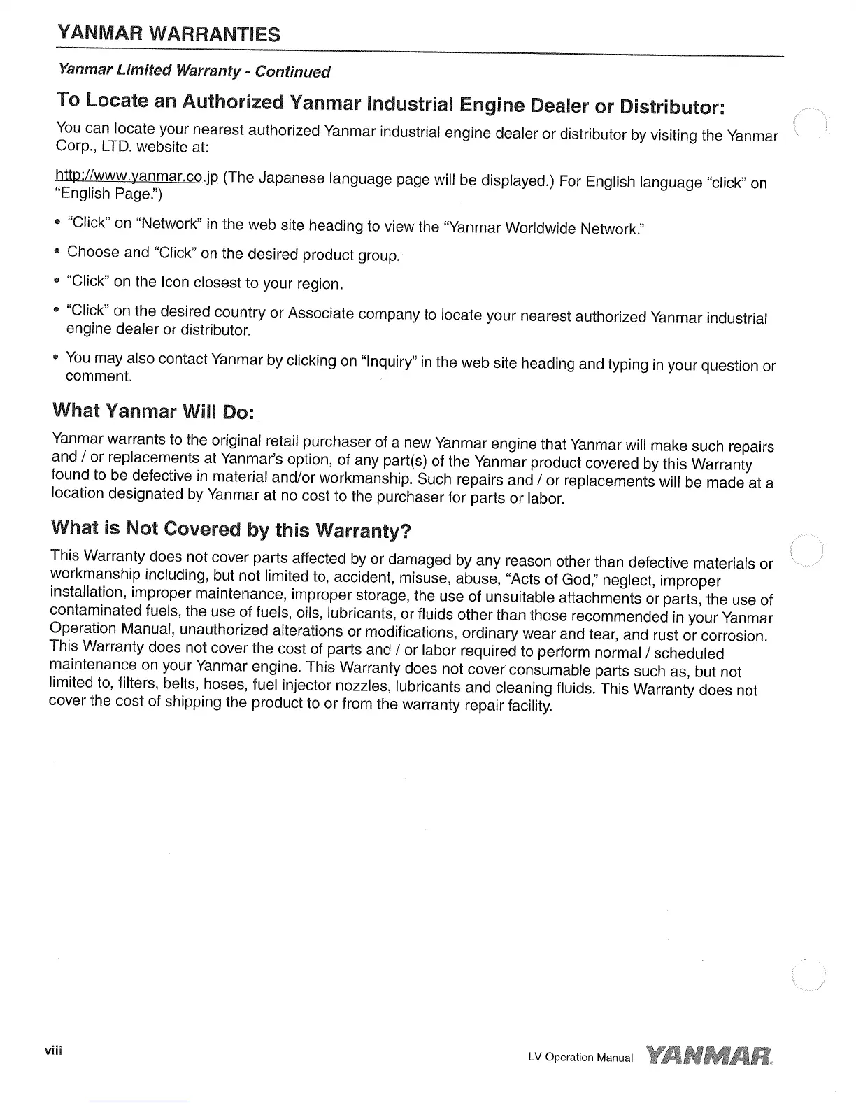 Yanmar L48V - Locating Authorized Dealers; Warranty Coverage and Exclusions