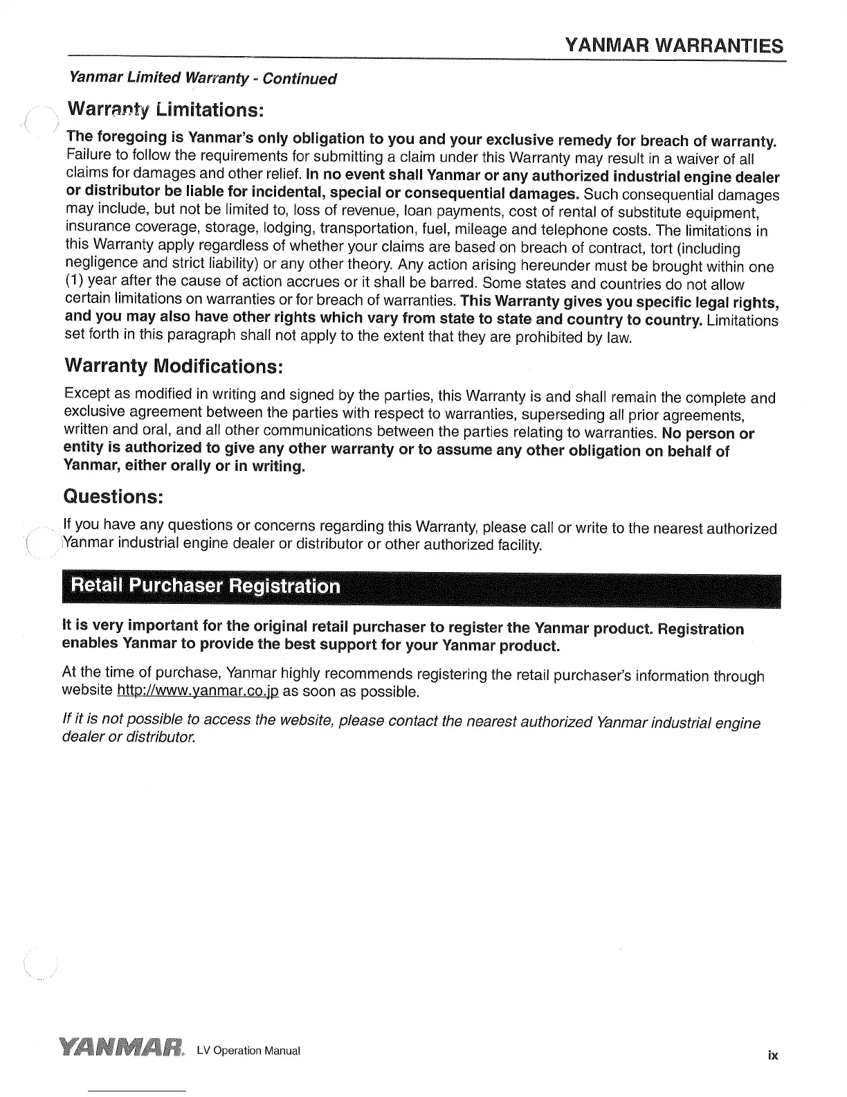 Yanmar L48V - Warranty Modifications and Questions; Retail Purchaser Registration