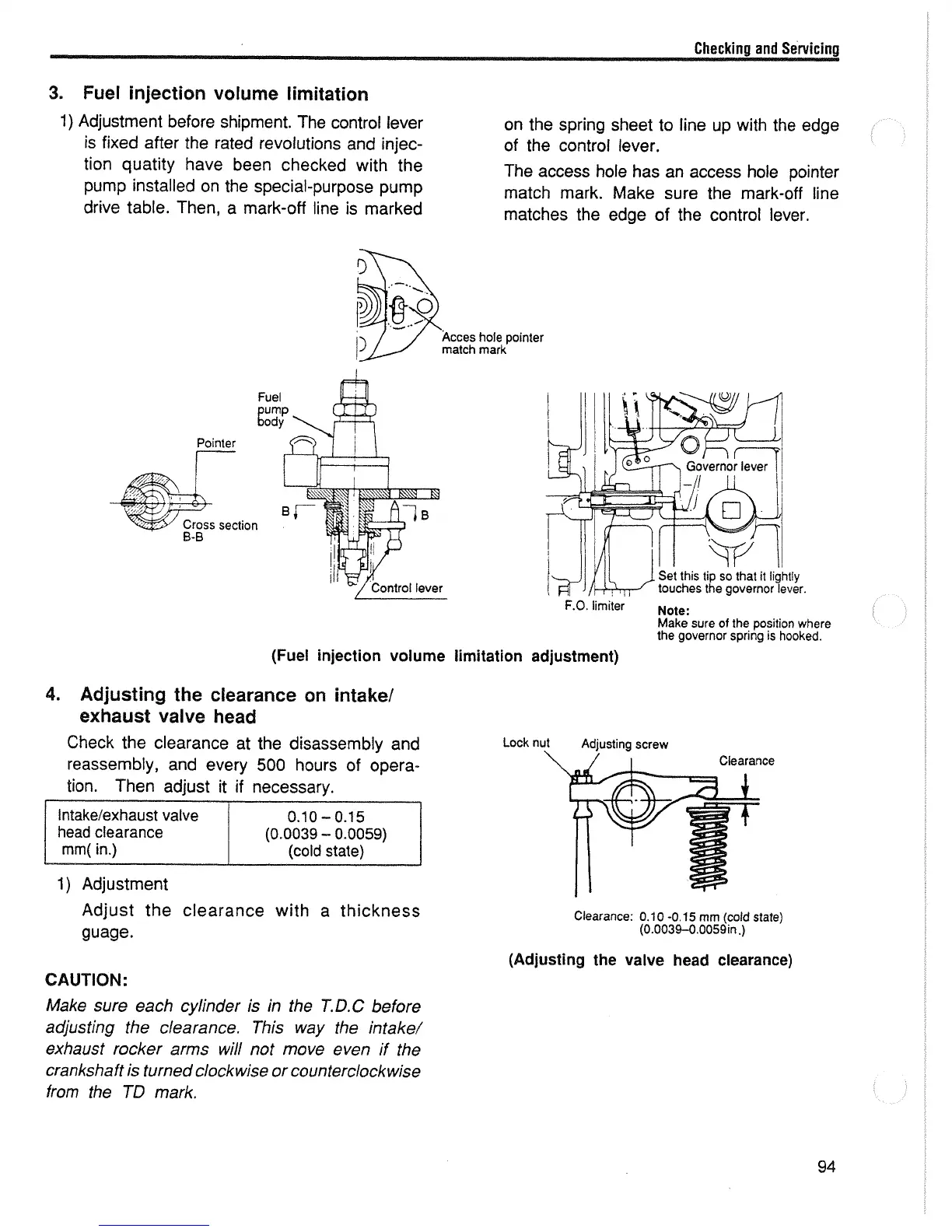 Yanmar L60AE - Fuel Injection Volume Limitation; Adjusting the Clearance on Intake;Exhaust Valve Head