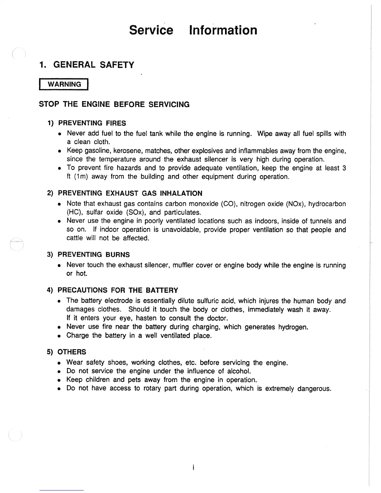 Yanmar L60AE - GENERAL SAFETY; STOP THE ENGINE BEFORE SERVICING; PREVENTING FIRES; PRECAUTIONS FOR THE BATTERY