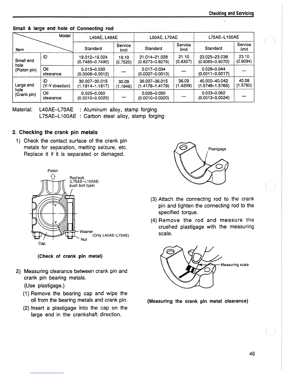 Yanmar L60AE - Small and Large End Hole of Connecting Rod Table; Checking the Crank Pin Metals