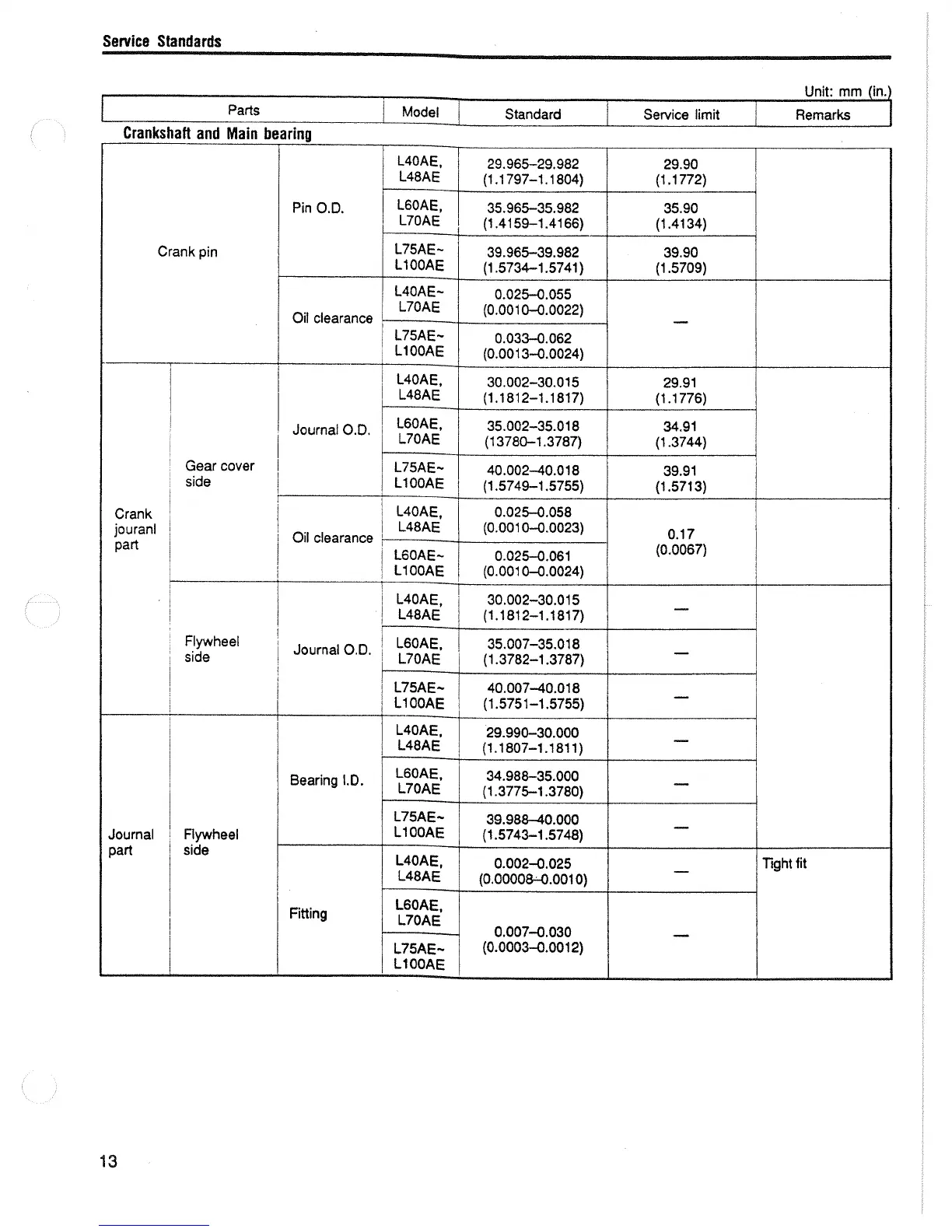 Yanmar L70AE - Crankshaft and Main Bearing Service Standards