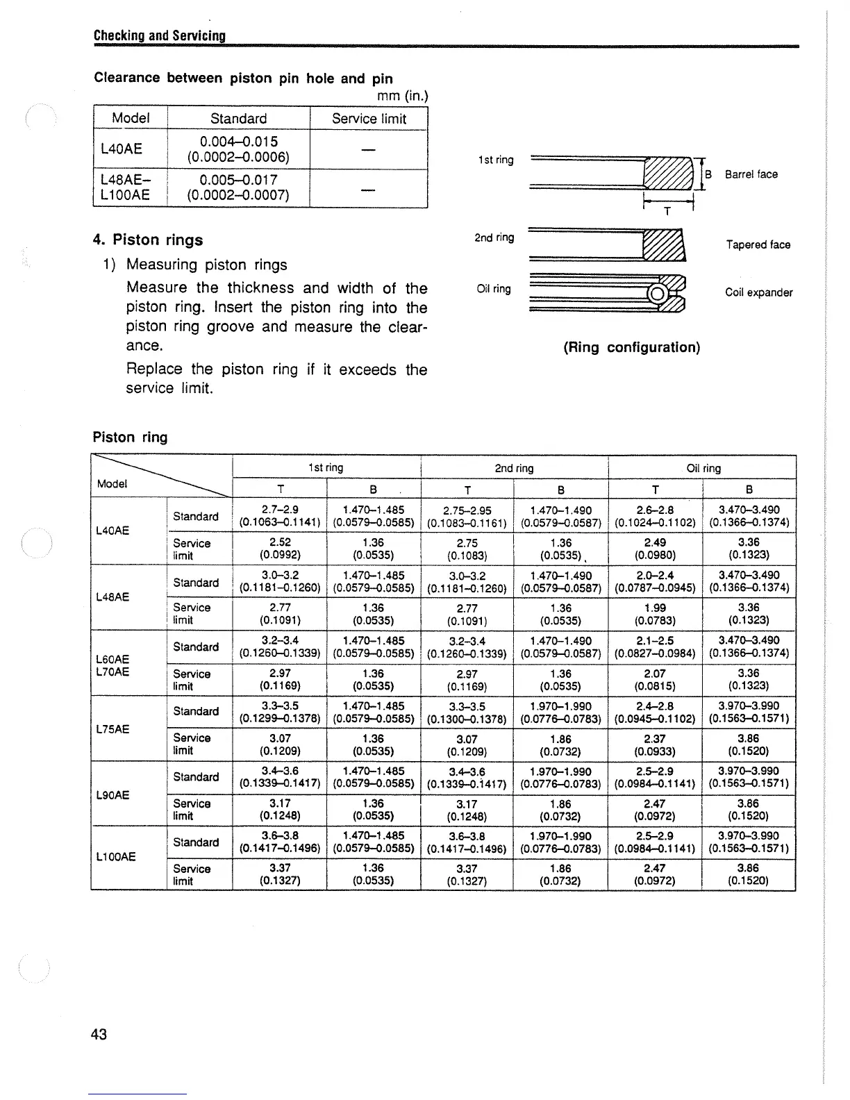 Yanmar L70AE - Piston Rings Servicing; Clearance between Piston Pin Hole and Pin Table