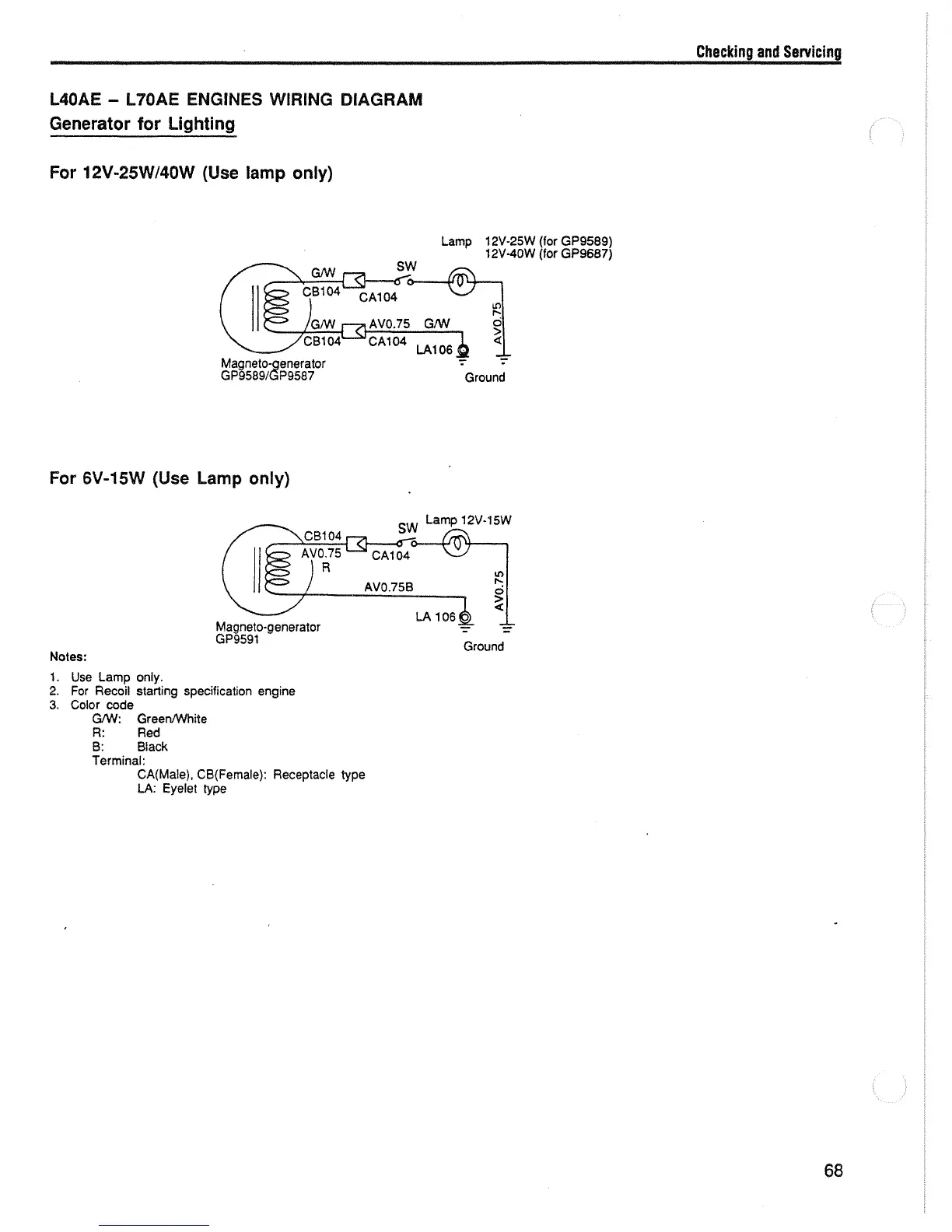 Yanmar L70AE - L40 AE - L70 AE Engines Wiring Diagram, (Generator for Lighting) for 12 V-25 W;40 W (Use Lamp Only); For 6 V-15 W (Use Lamp Only)