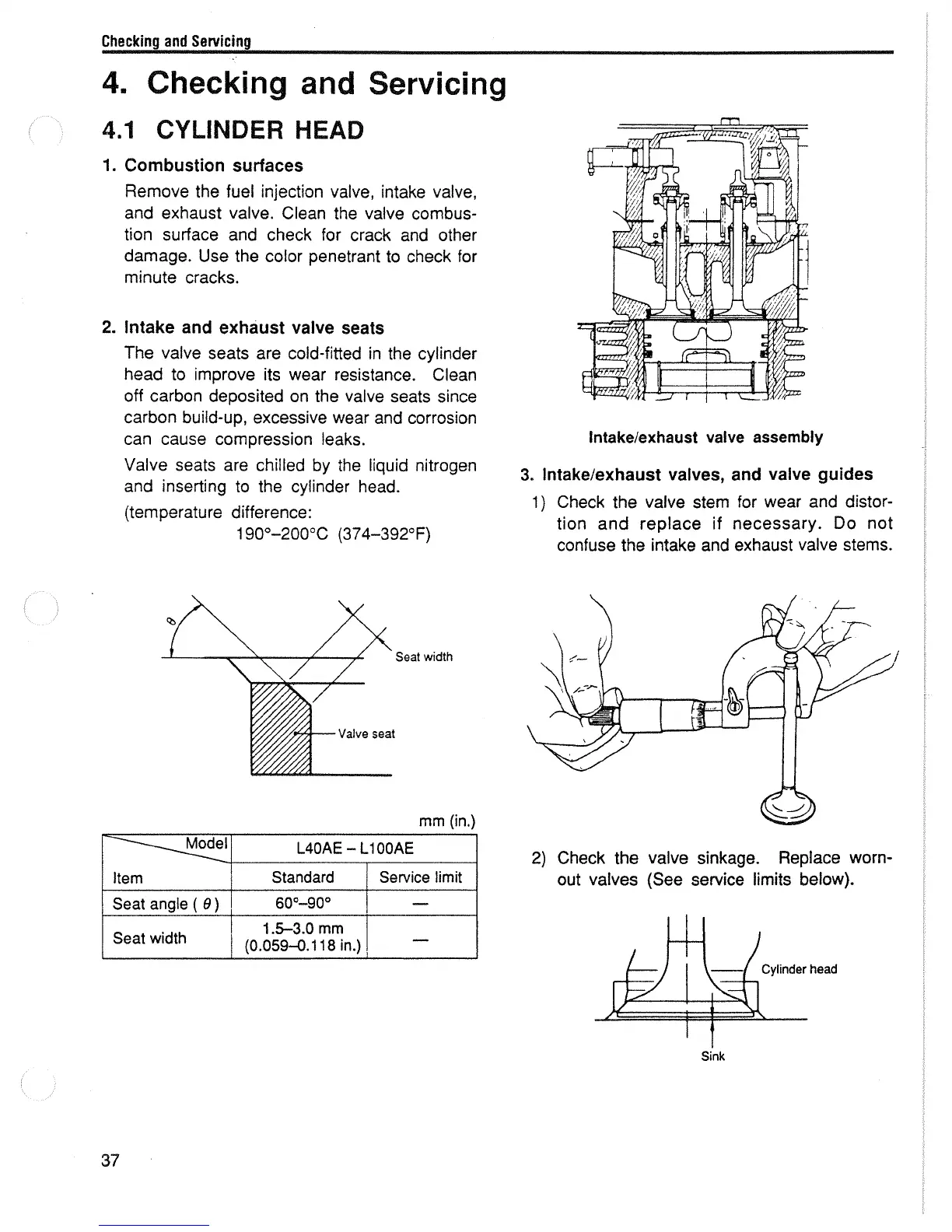 Yanmar L90AE - Checking and Servicing; Cylinder Head Checking and Servicing; Combustion Surfaces Servicing; Intake and Exhaust Valve Seats, Valve Guides Servicing