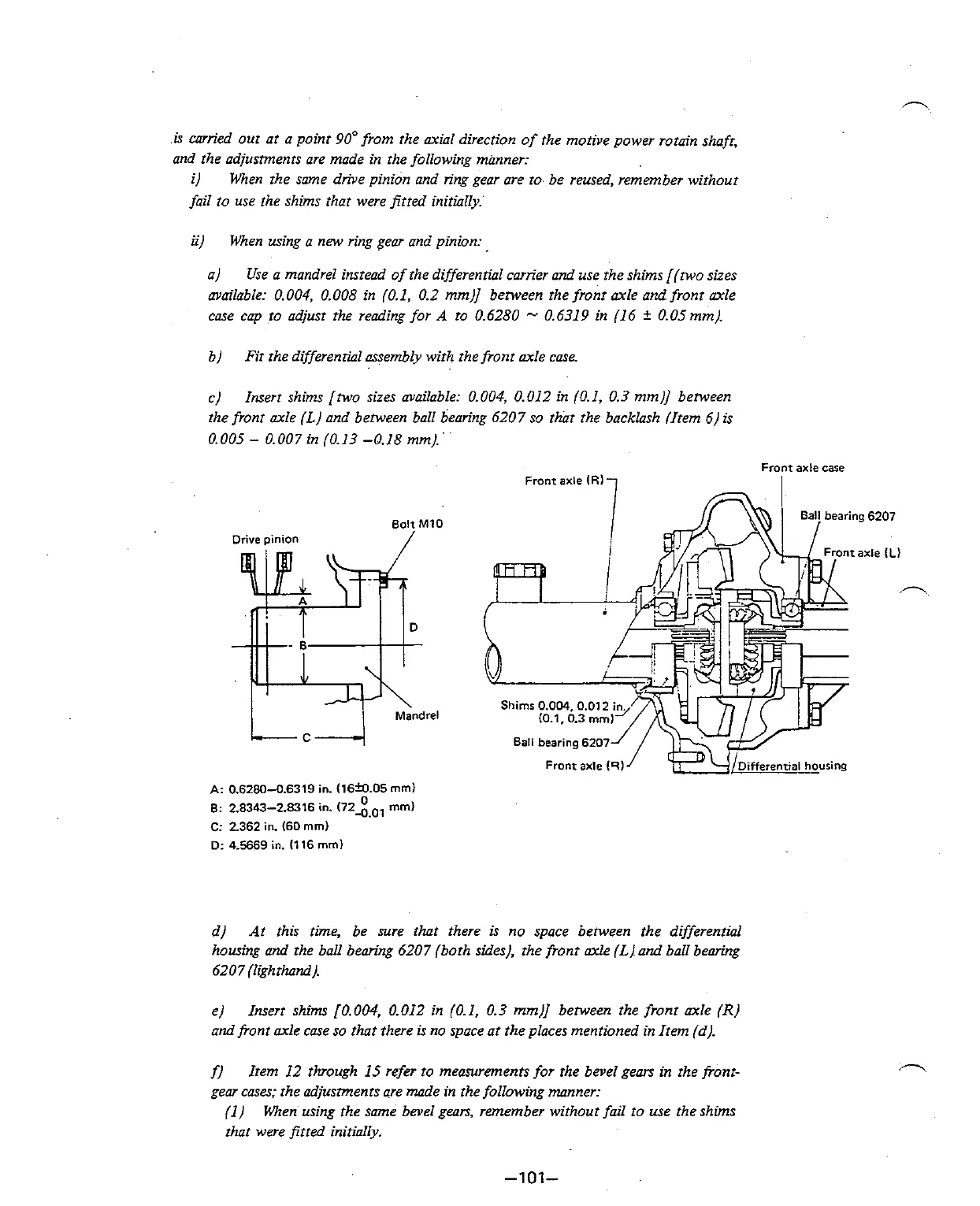 [0.004. 0.012 in (0.1, 0.3 mm)] between the fronr axle (R]