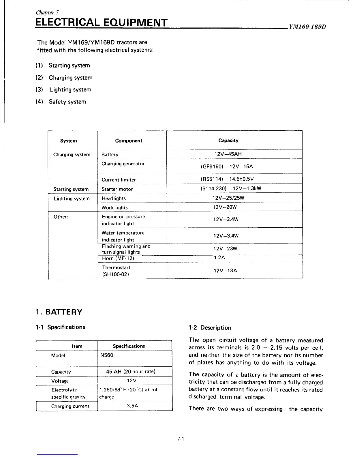 Yanmar YM169 - Battery Specifications and Inspection
