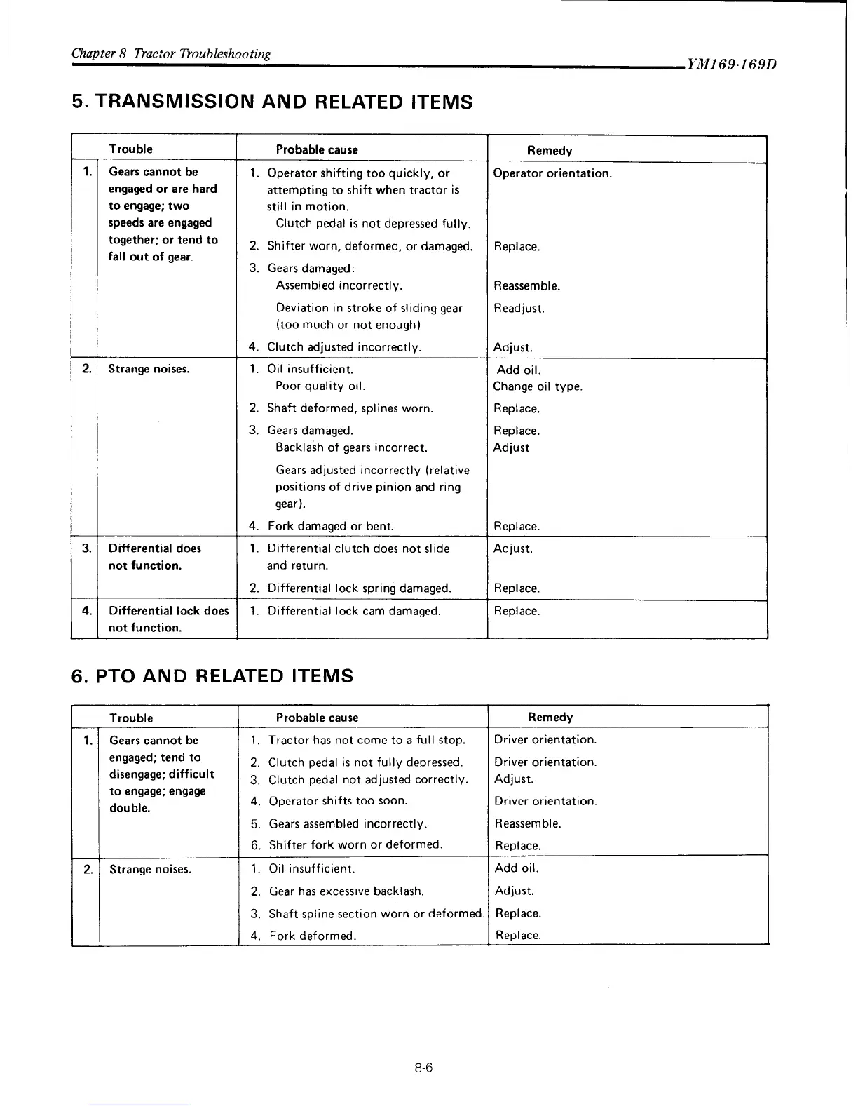 Yanmar YM169 - Transmission and Related Items Troubleshooting; PTO and Related Items Troubleshooting