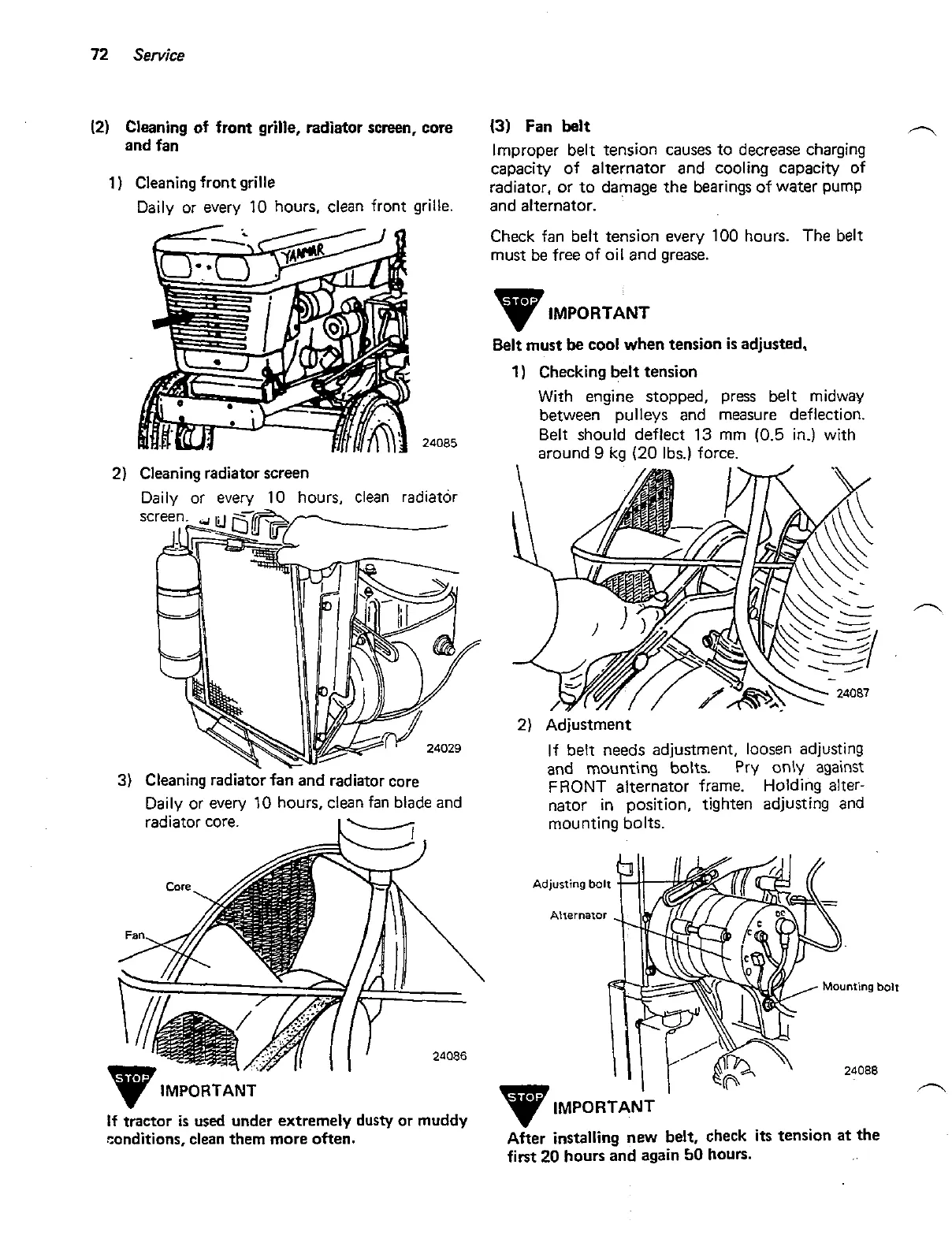 Check fan belt tension every 100 hours. The belt