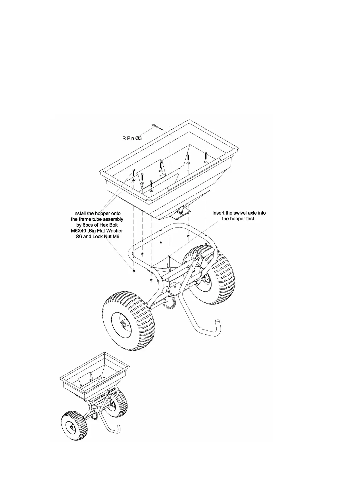 1. Lower the hopper into the Frame Assembly, carefully line up the hole in the bottom of the hopper with