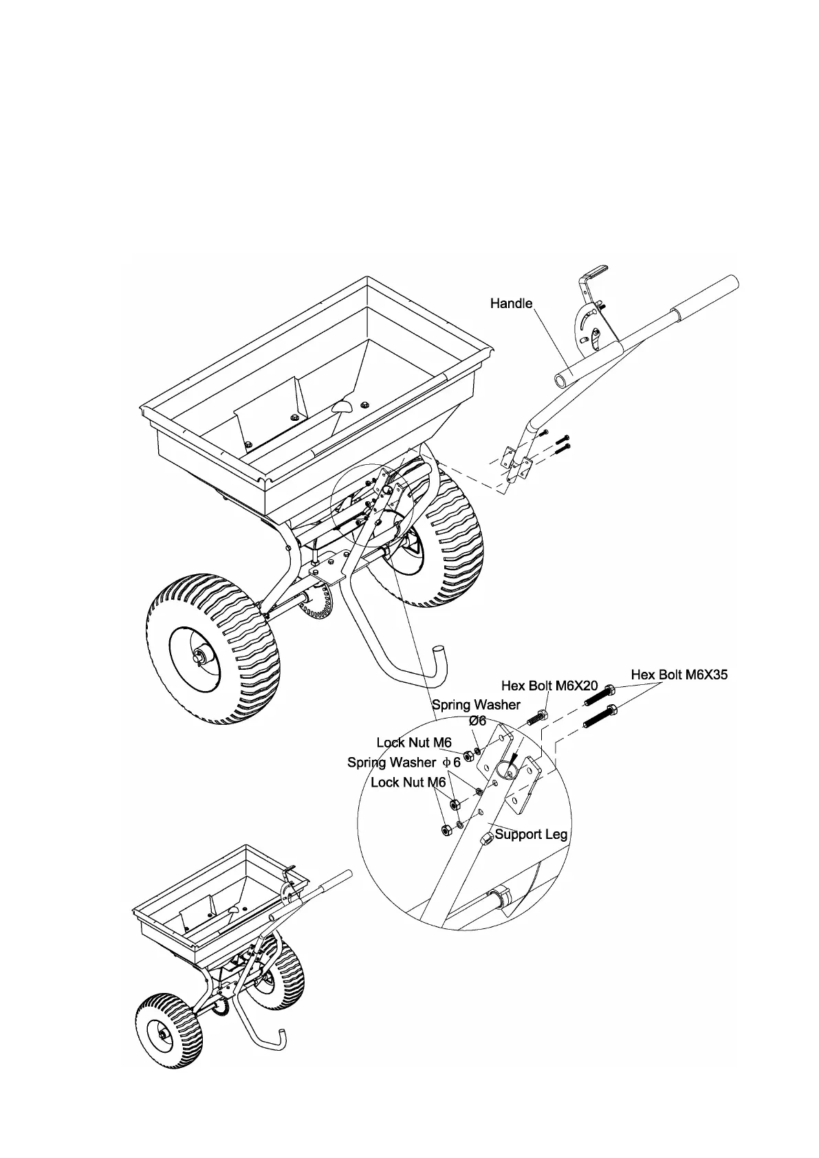 2. Insert two hex bolts M6x35 into the two holes on the support leg and tighten with spring washers Ø6