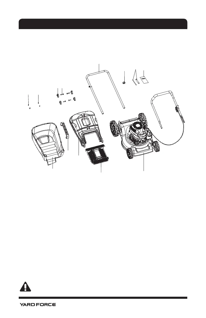 Carefully remove the lawn mower from its packaging and check as the following parts are