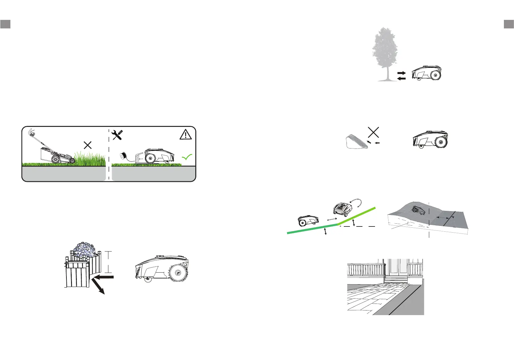 Hindernisse, die höher als 100 mm sind, wie zum Beispiel Wände, Zäune und Gartenmöbel. Sobald