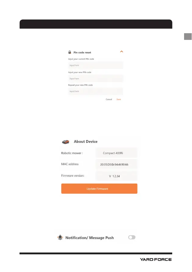 Here you ca n change the mower PIN code, the default PIN code is: 0000