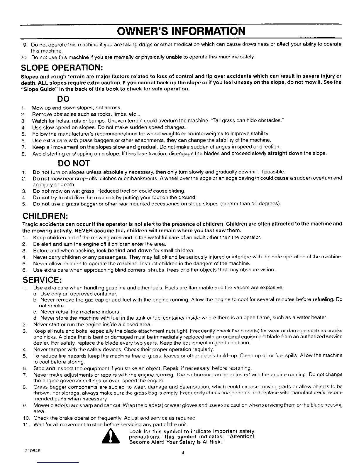 5. Do not use a grass bagger or other rear mounted accessories on steep slopes (greater than 10 degrees)