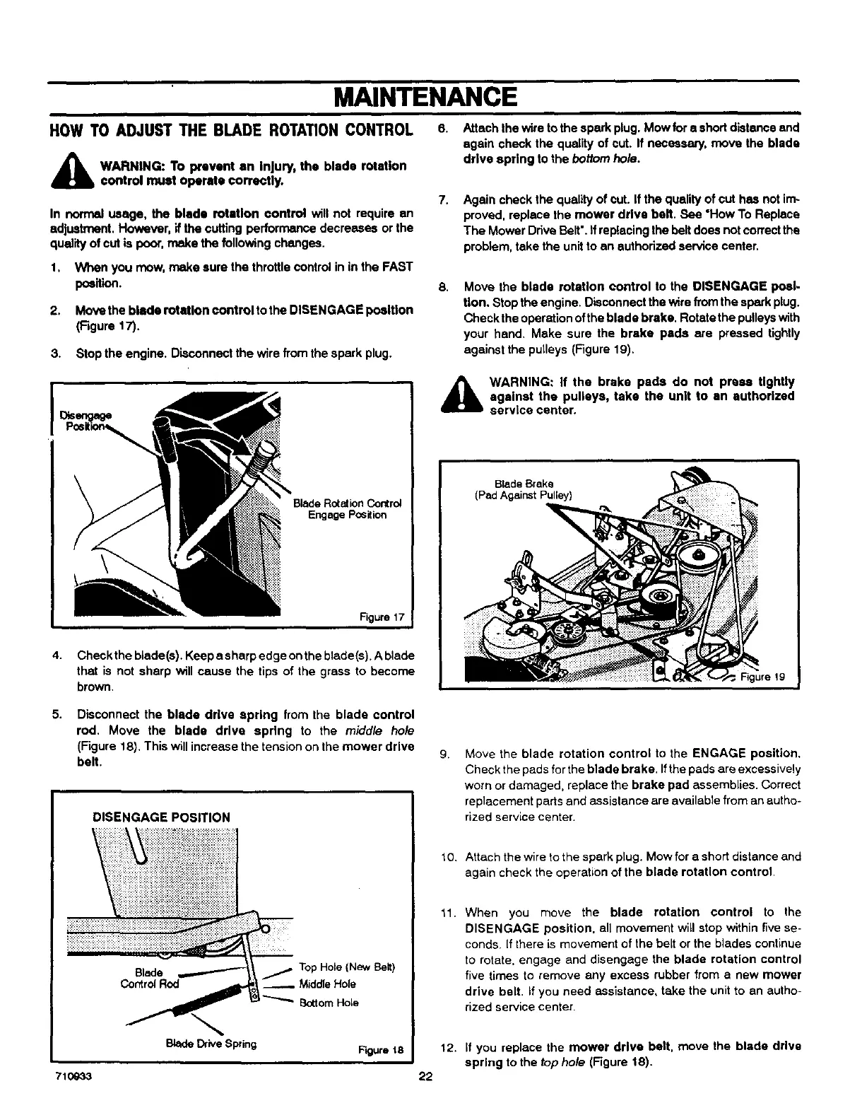Check the operation ofthe blade brake. Rotate the pulleyswith