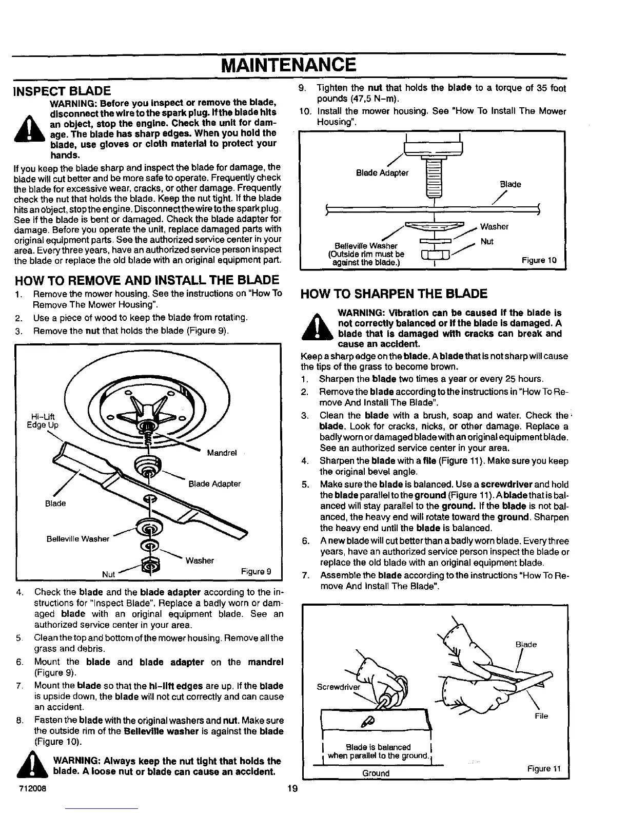 structions for "Inspect Blade". Replace a badly worn or dam-