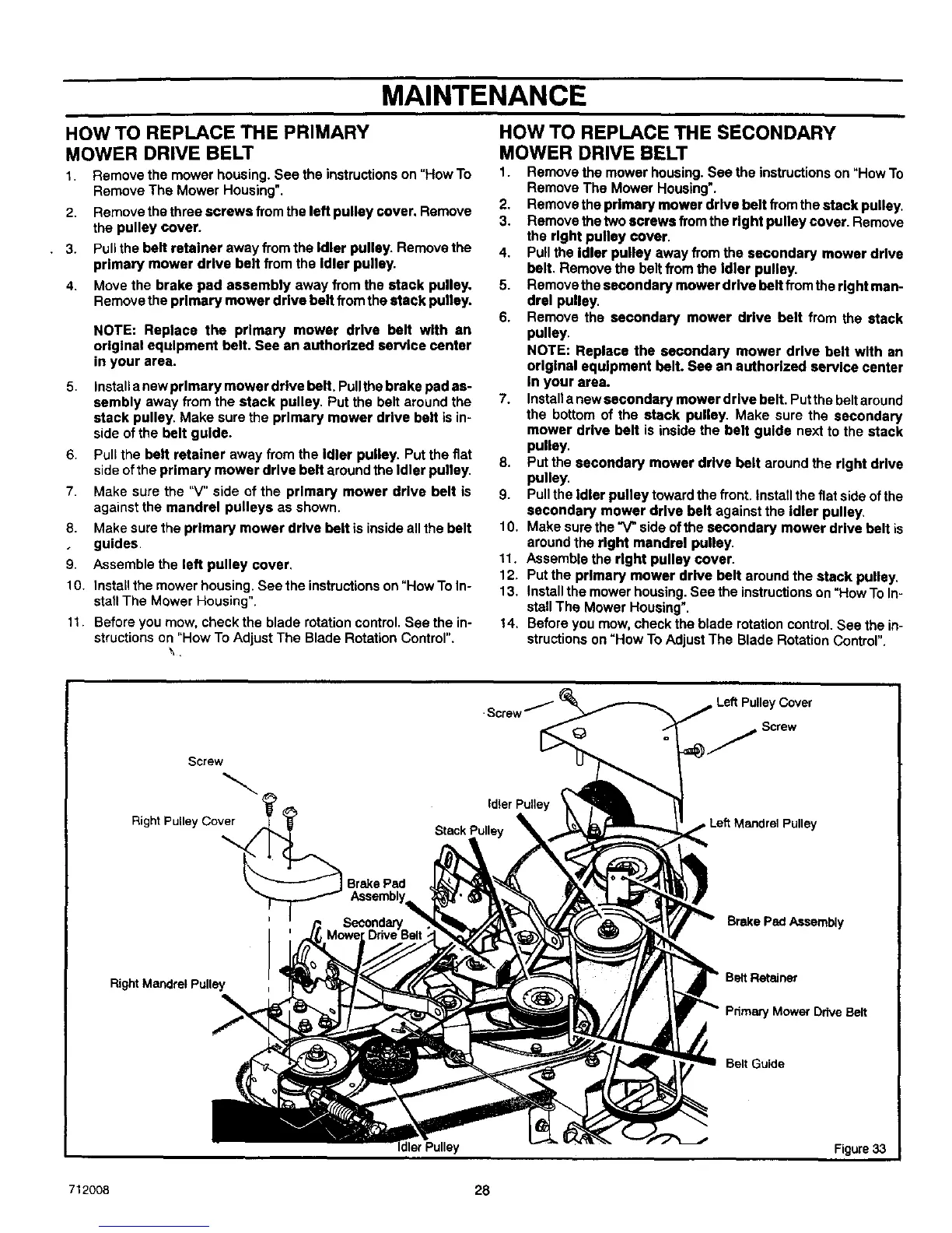 secondary mower drive belt against the idler pulley,