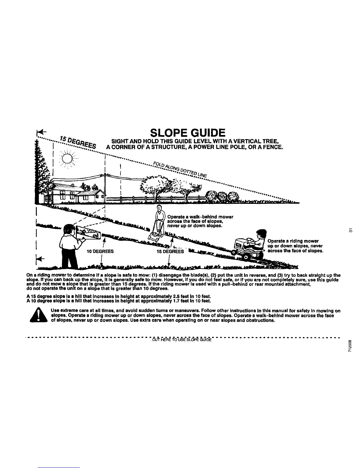 slopes. Operate a riding mower up or down slopee, never across the face of slopes. Operate a walk-behind mower across the face