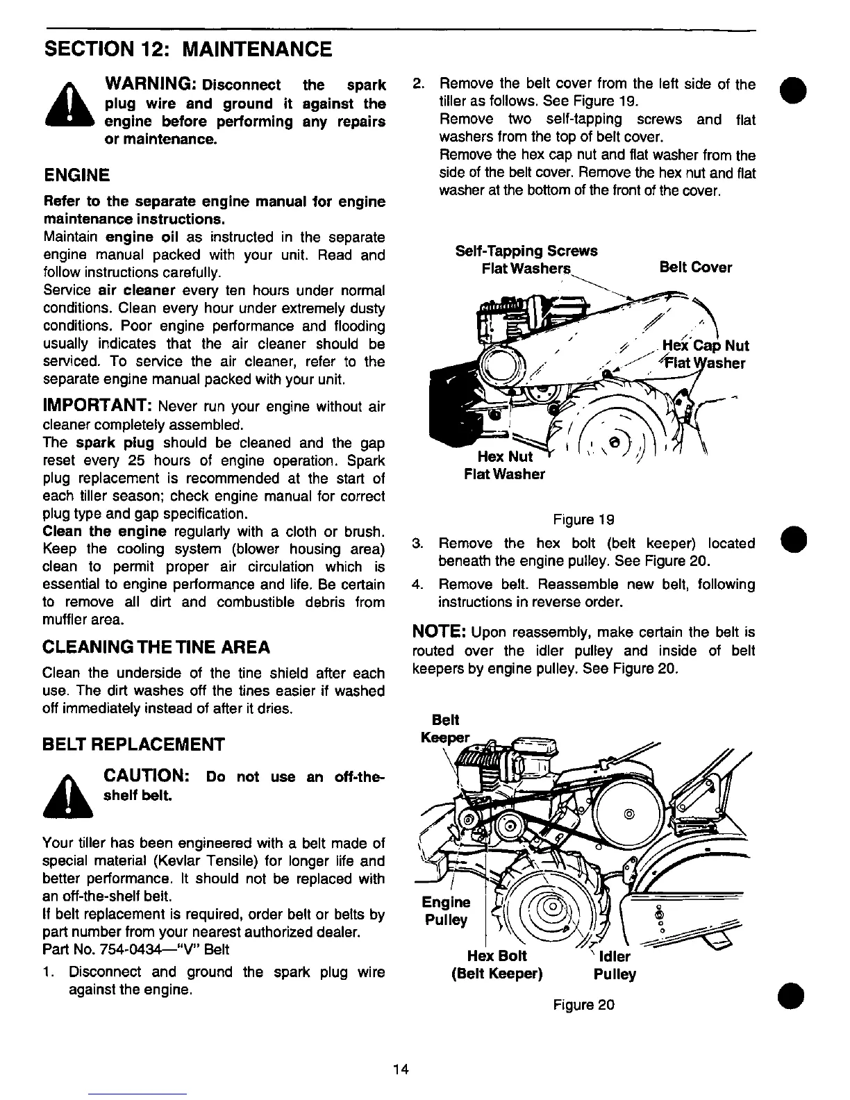 Yard Machines 430 - SECTION 12: MAINTENANCE; ENGINE; CLEANING THE TINE AREA; BELT REPLACEMENT