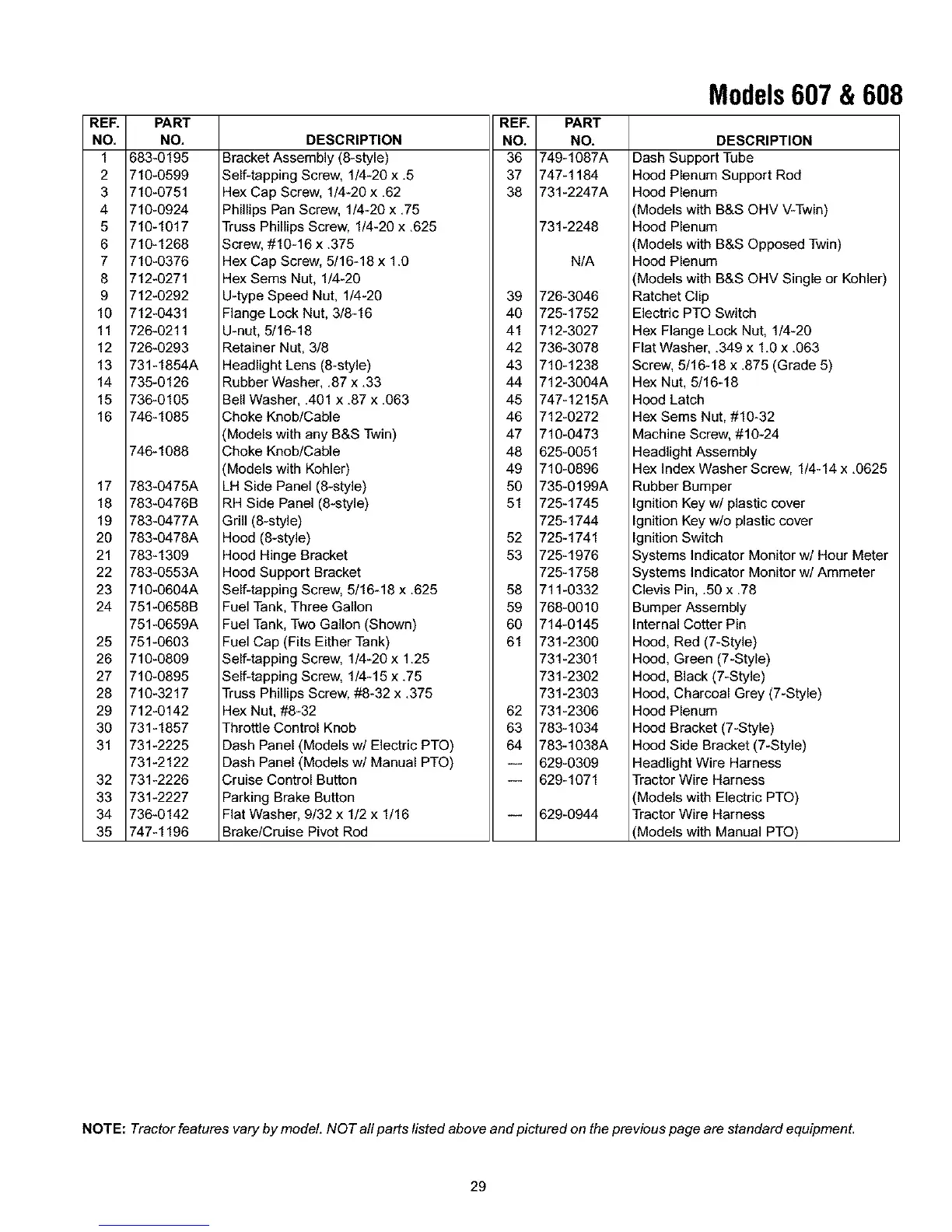 NOTE: Tractor features vary by model. NOT all parts listed above and pictured on the previous page are standard equipment.