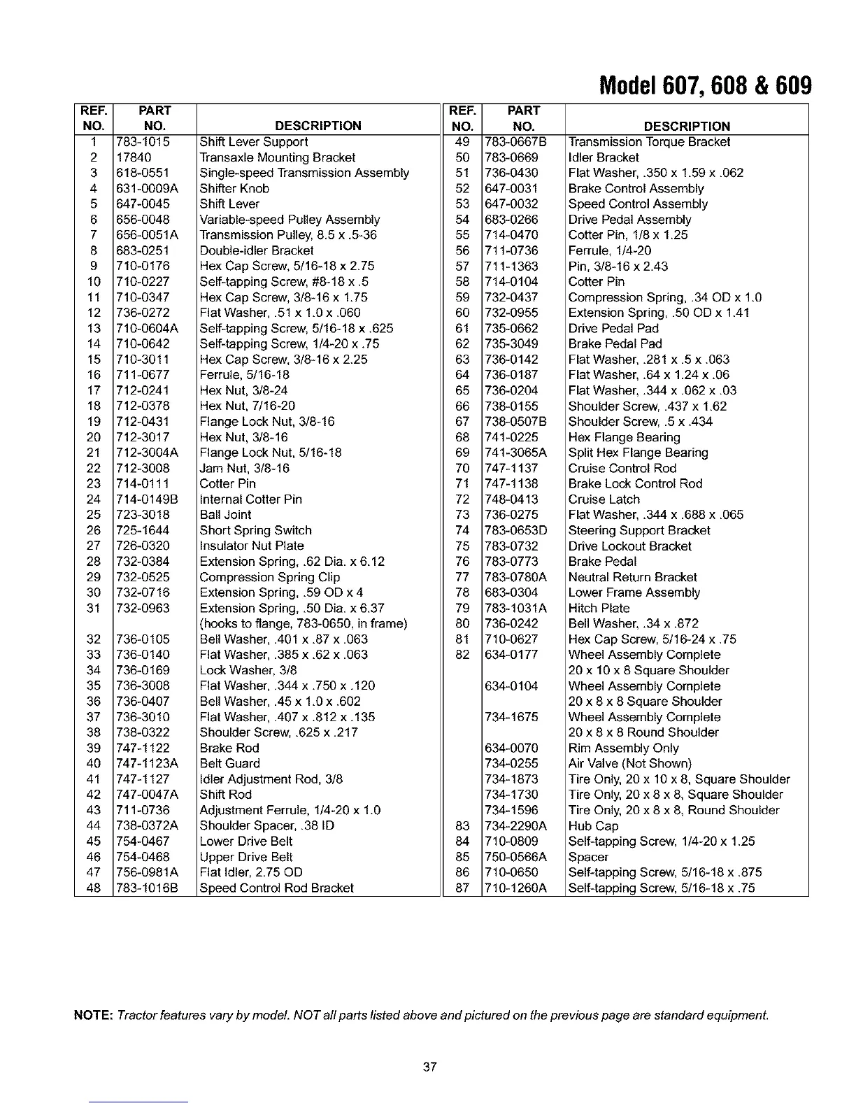 NOTE: Tractor features vary by model. NOT all parts listed above and pictured on the previous page are standard equipment.