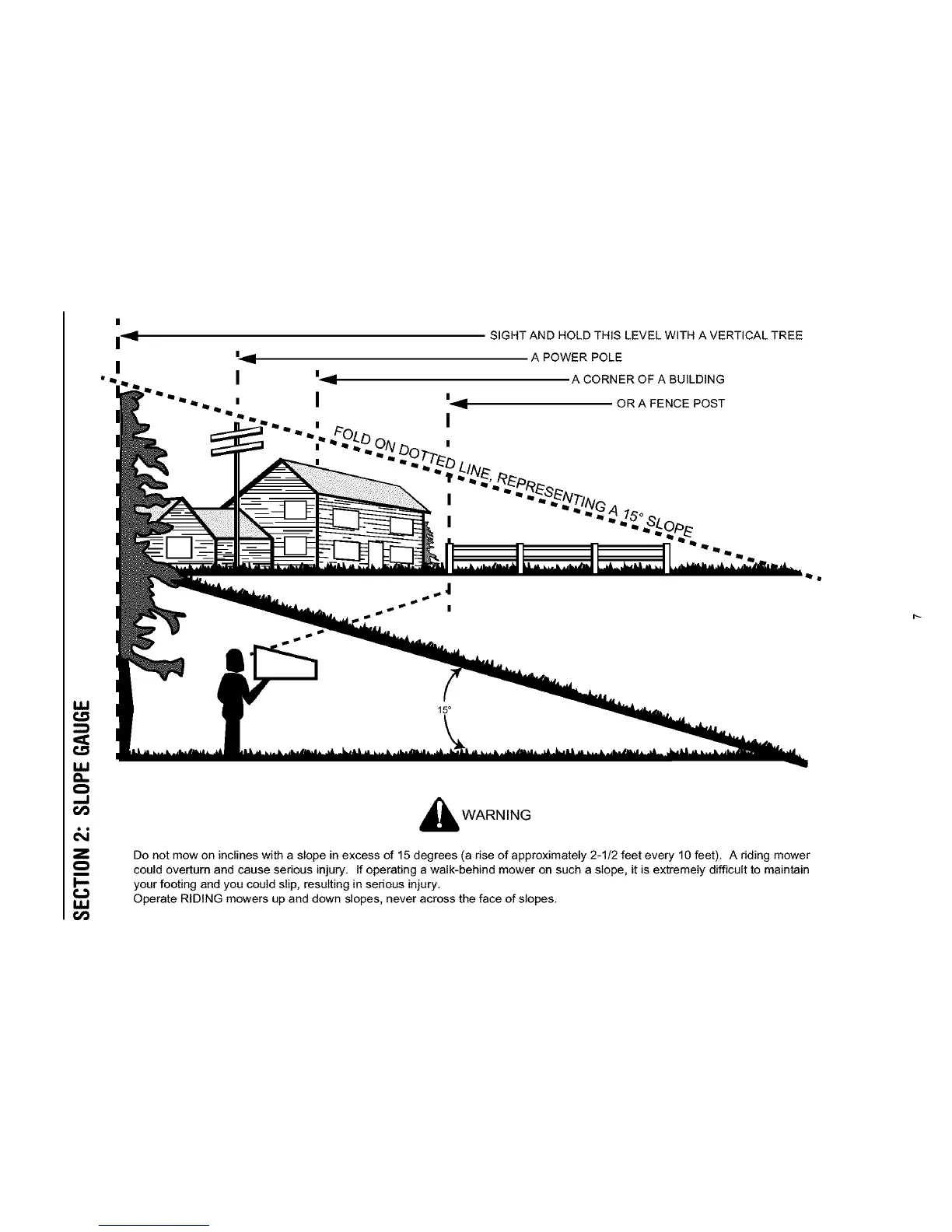 Do not mow on inclines with a slope in excess of 15 degrees (a rise of approximately 2-1/2 feet every 10 feet). A riding mower