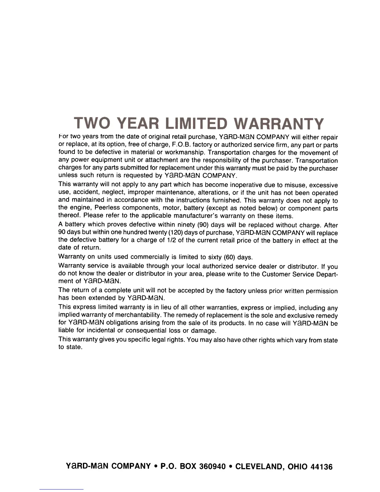 YaRD-MaN COMPANY. P.O. BOX 360940 .CLEVELAND, OHIO 44136
