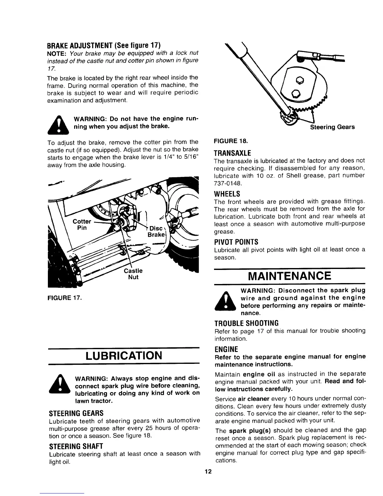 Yard-Man 132634E - Lubrication; Maintenance; Brake Adjustment; Transaxle