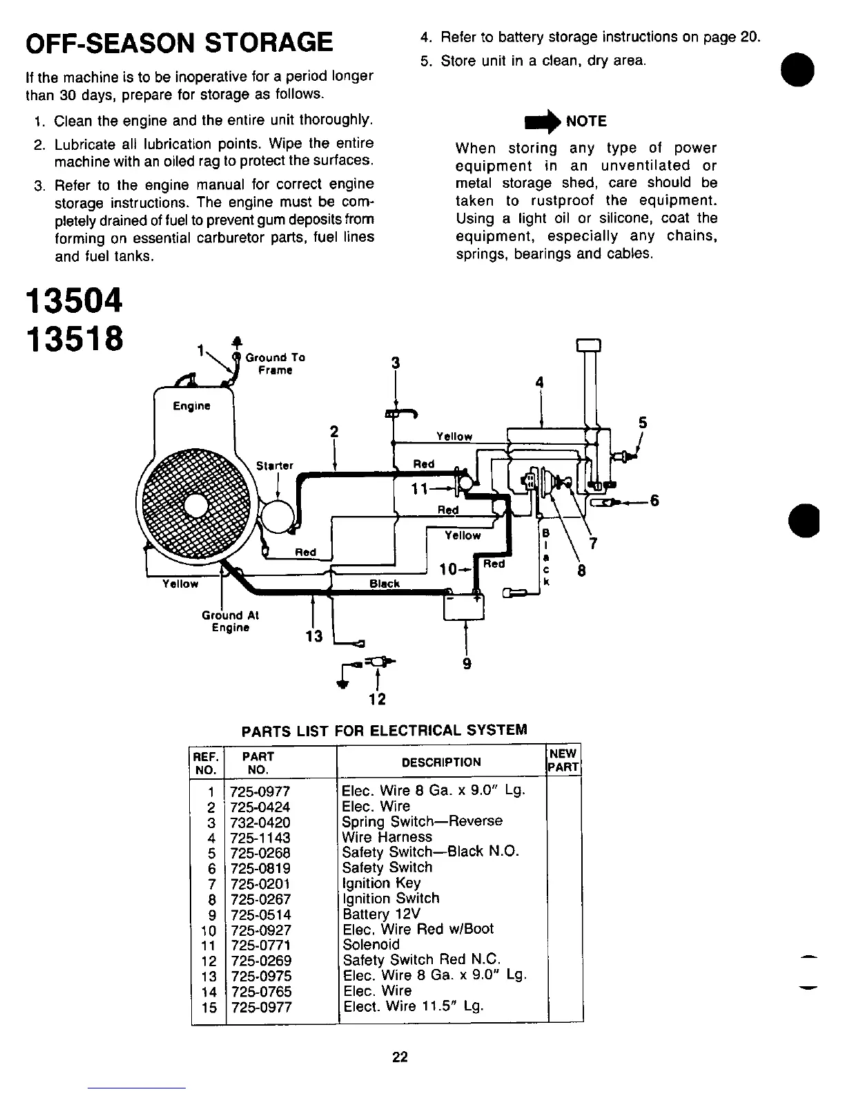 Yard-Man 13504-8 - Off-Season Storage; Electrical System Diagram