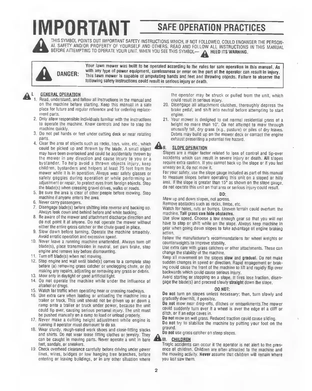 Yard-Man 135N604F401 - SAFE OPERATION PRACTICES; GENERAL OPERATION; SLOPE OPERATION; CHILD SAFETY