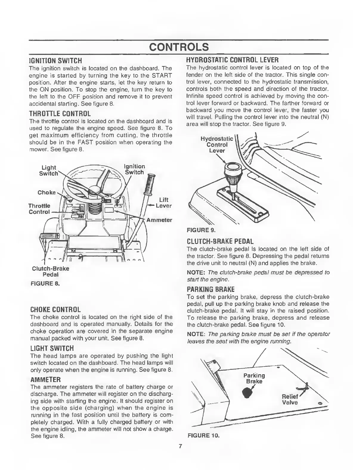 Yard-Man 135N604F401 - CONTROLS OVERVIEW; IGNITION AND THROTTLE CONTROLS; HYDROSTATIC AND BRAKE CONTROLS