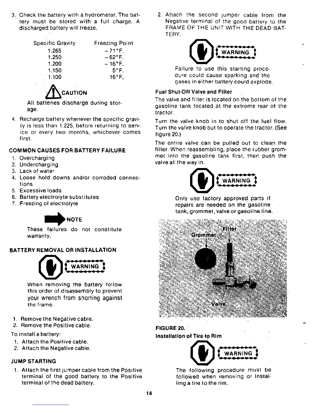 Yard-Man 13780-0 - Common Causes for Battery Failure; Fuel Shut-Off Valve and Filter; Battery Removal and Installation; Installation of Tire to Rim