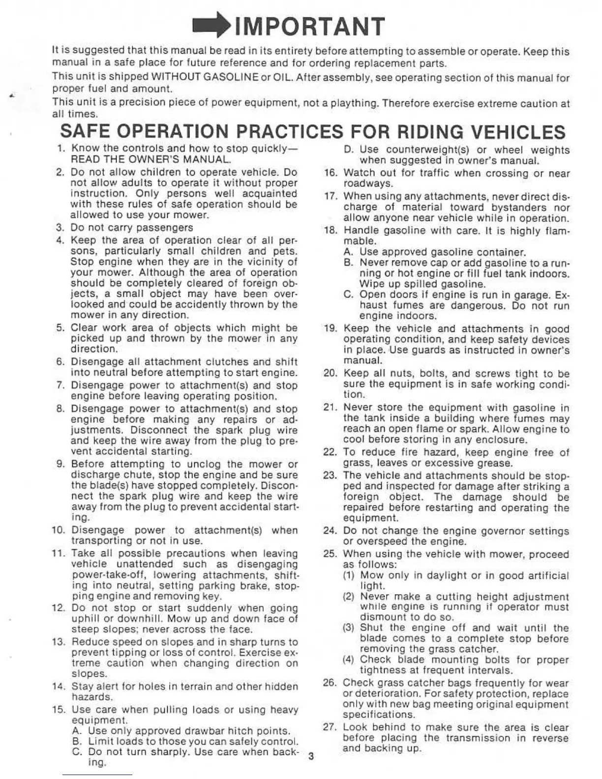 Yard-Man 14995-0 - IMPORTANT SAFETY PRACTICES; Safe Operation Practices for Riding Vehicles; Gasoline Handling Precautions; Equipment Inspection and Maintenance