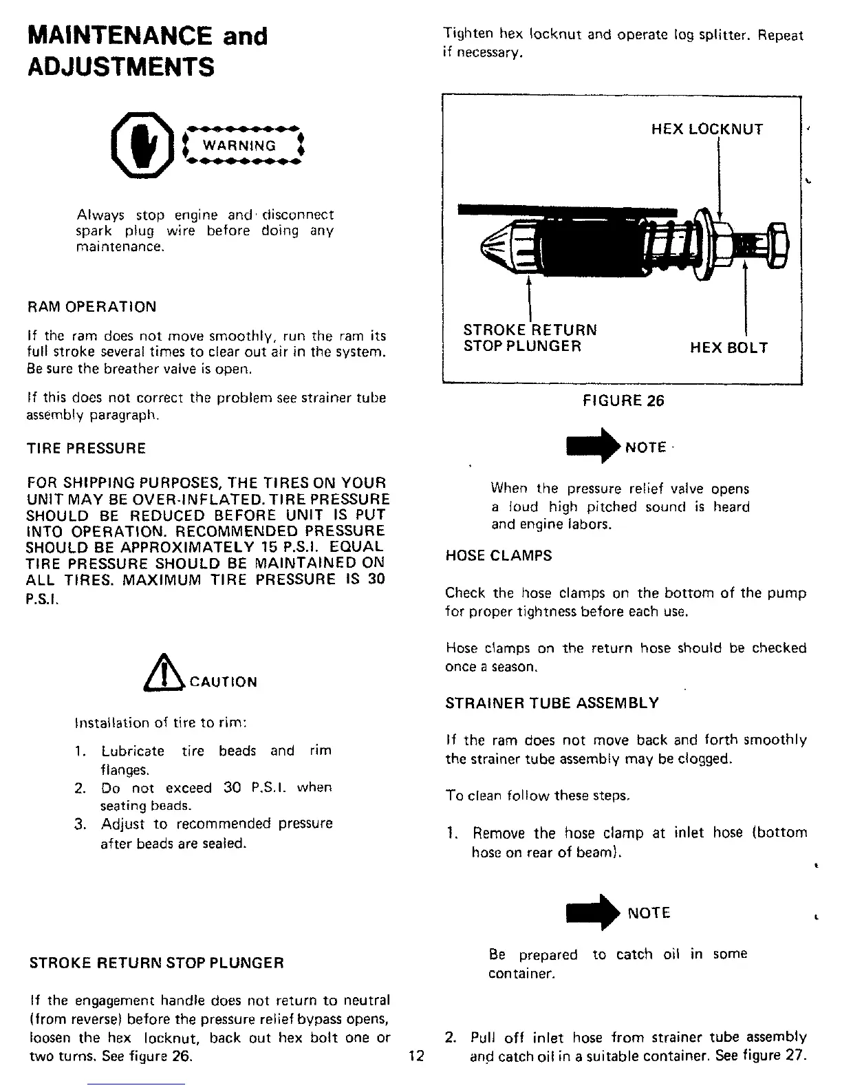 Yard-Man 24645-9 - Maintenance and Adjustments; Ram Operation; Tire Pressure; Hose Clamps
